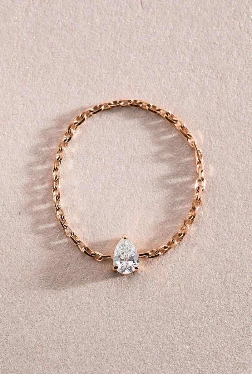 Cette bague idéale à offrir ou à s’offrir satisfera au quotidien la personne qui la porte grâce à la brillance du très joli diamant en forme de poire se trouvant au centre de la bague de 0,10 carat monté sur un serti griffe en or rose. Une chaîne en or rose vient maintenir le diamant autour de votre doigt. De plus, elle se fera très discrète autour de celui-ci grâce à sa finesse.