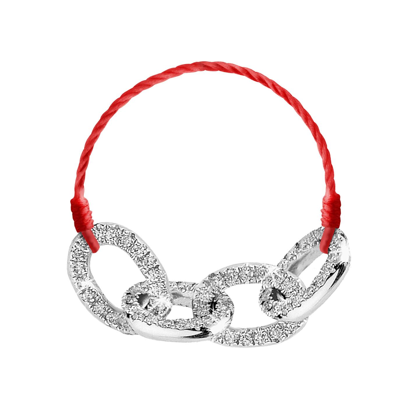 Le sacre du diamant! Quatre maillons pavés de diamants (0,18 carat) ornent cette précieuse bague en fil. Elle est disponible en quatre couleurs d'or et 80 couleurs de fils.
