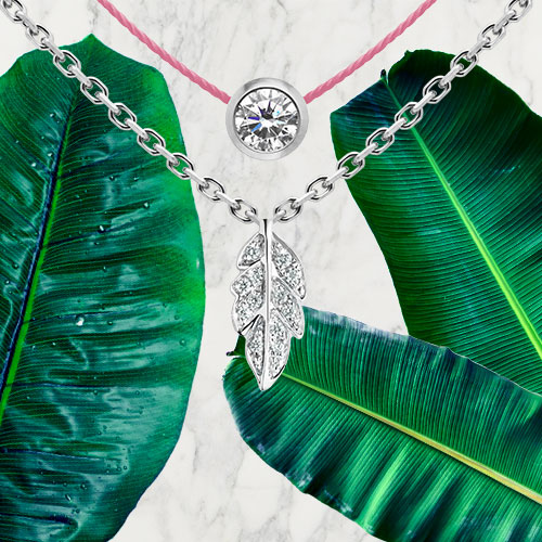 Notre collier "Douceur", cette jolie petite feuille en or blanc et incrustée de diamants est le bijou qui se marie parfaitement à la tendance des palmiers et de l'été en cours.